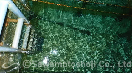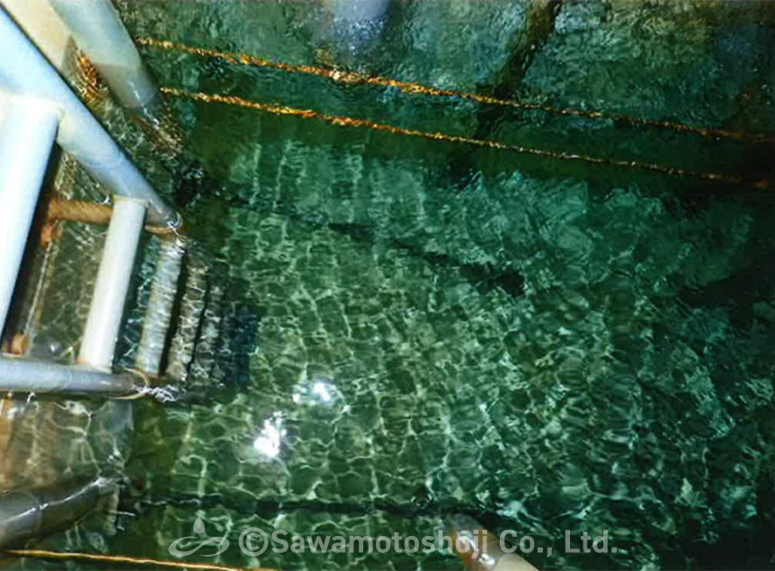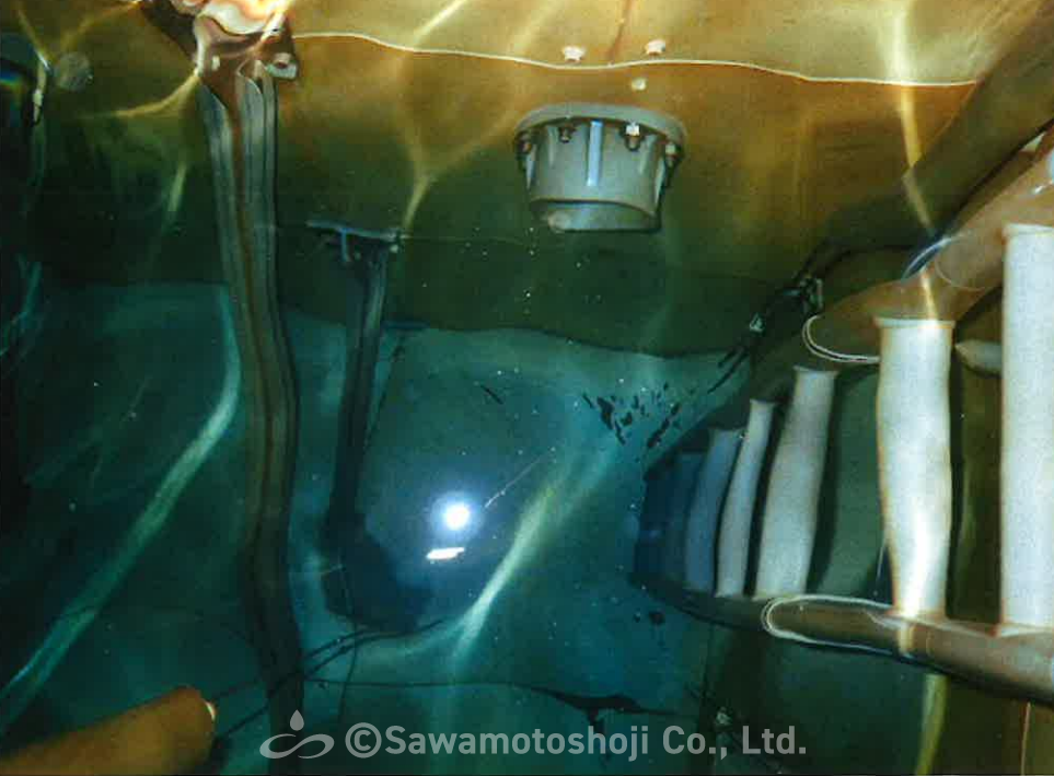 昨年度のような壁面の茶色い付着物は大幅に減少しているのがわかります。水が張られている状態ですが、水槽の底にある配管や梯子がくっきりと見えるほど、水が透き通っています。