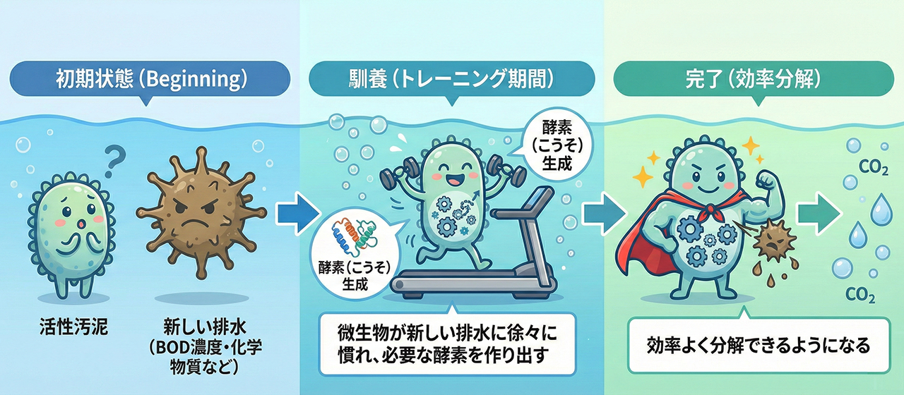 微生物は、特定の有機物(BOD)を分解するために、その物質に対応した「酵素(こうそ)」を体内で作る必要があります。馴養とは、微生物がその酵素を十分に作り出し、新しい排水を効率よく分解できるようになるまでの「トレーニング期間」とも言えます。