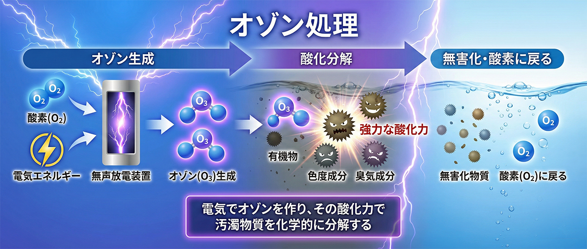 オゾン処理とは、オゾン(O₃)という物質が持つ、非常に強力な「酸化力」を利用して、排水中の汚濁物質を化学的に分解する排水処理技術です。