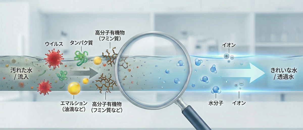 この孔の大きさは、MF膜では除去できない、より微細な粒子を分離できます。水に溶けているイオン類は通過させますが、ウイルス、タンパク質、エマルション(油滴など)、高分子の有機物(フミン質など)といった、比較的「分子量が大きい」物質を効率よく阻止します。